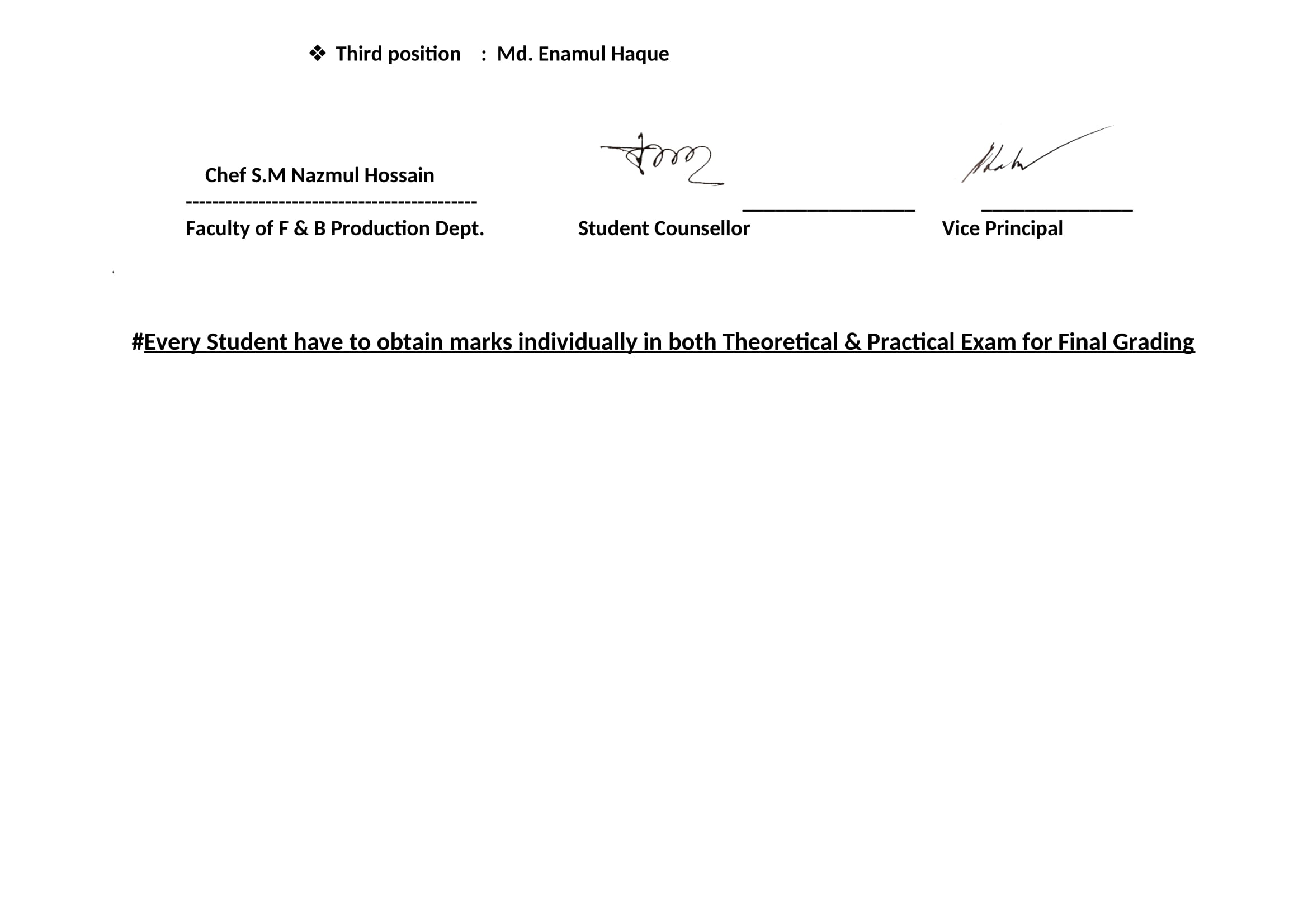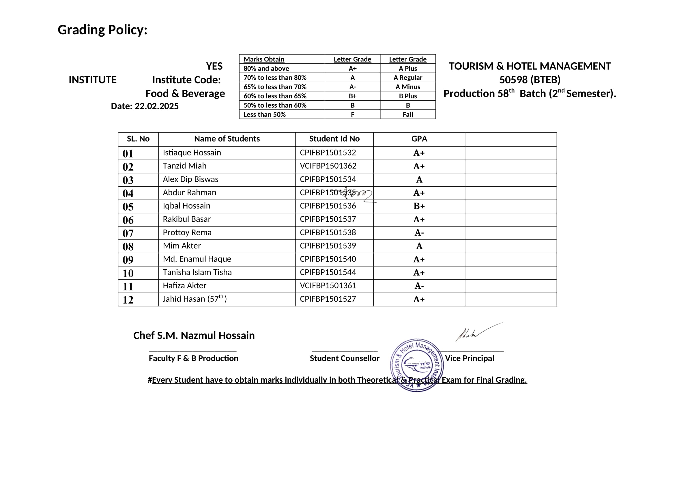 F & B Production 58th Batch 2nd Semester Final Result