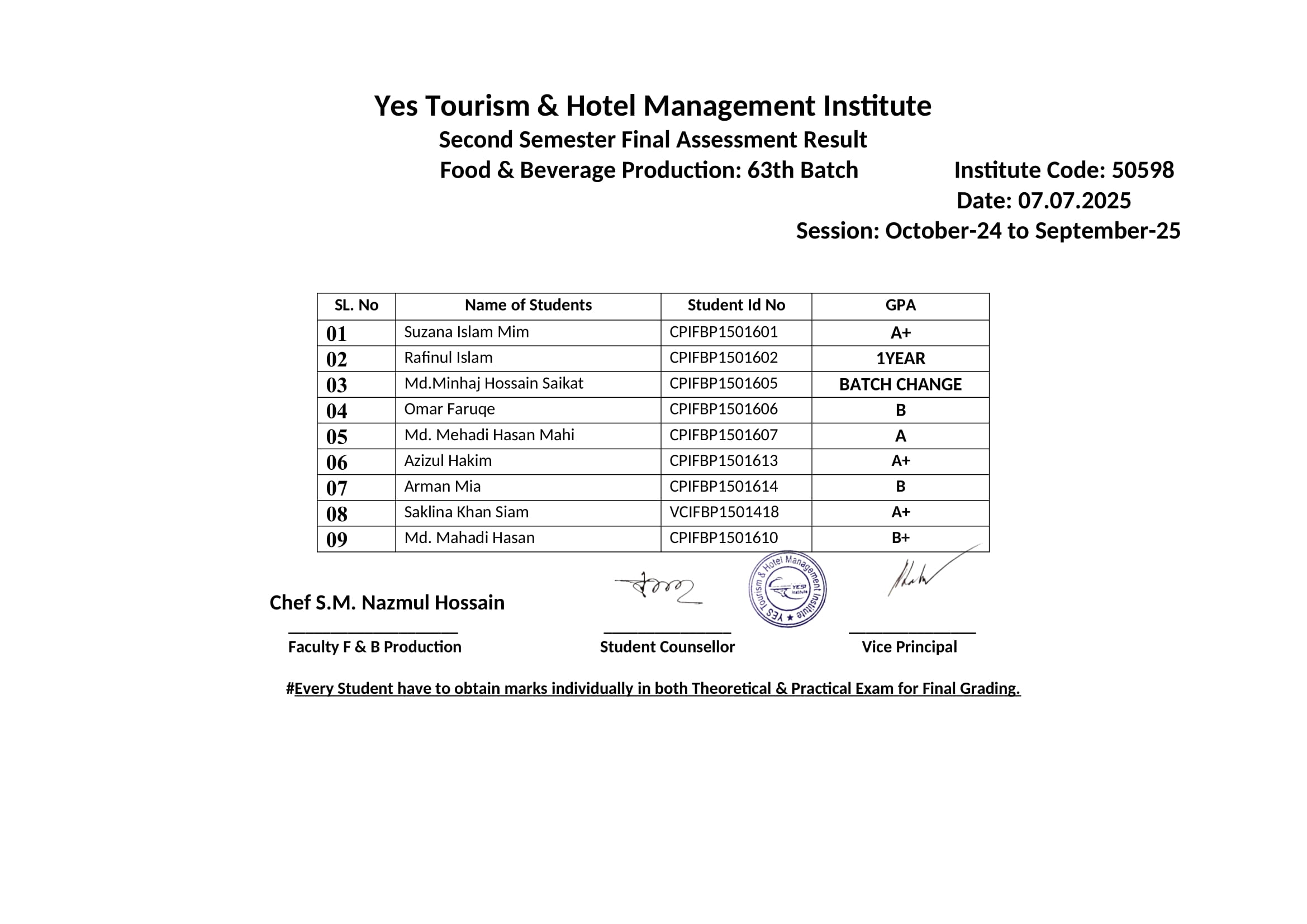 F & B Production 63rd Batch 2nd Semester Final Result