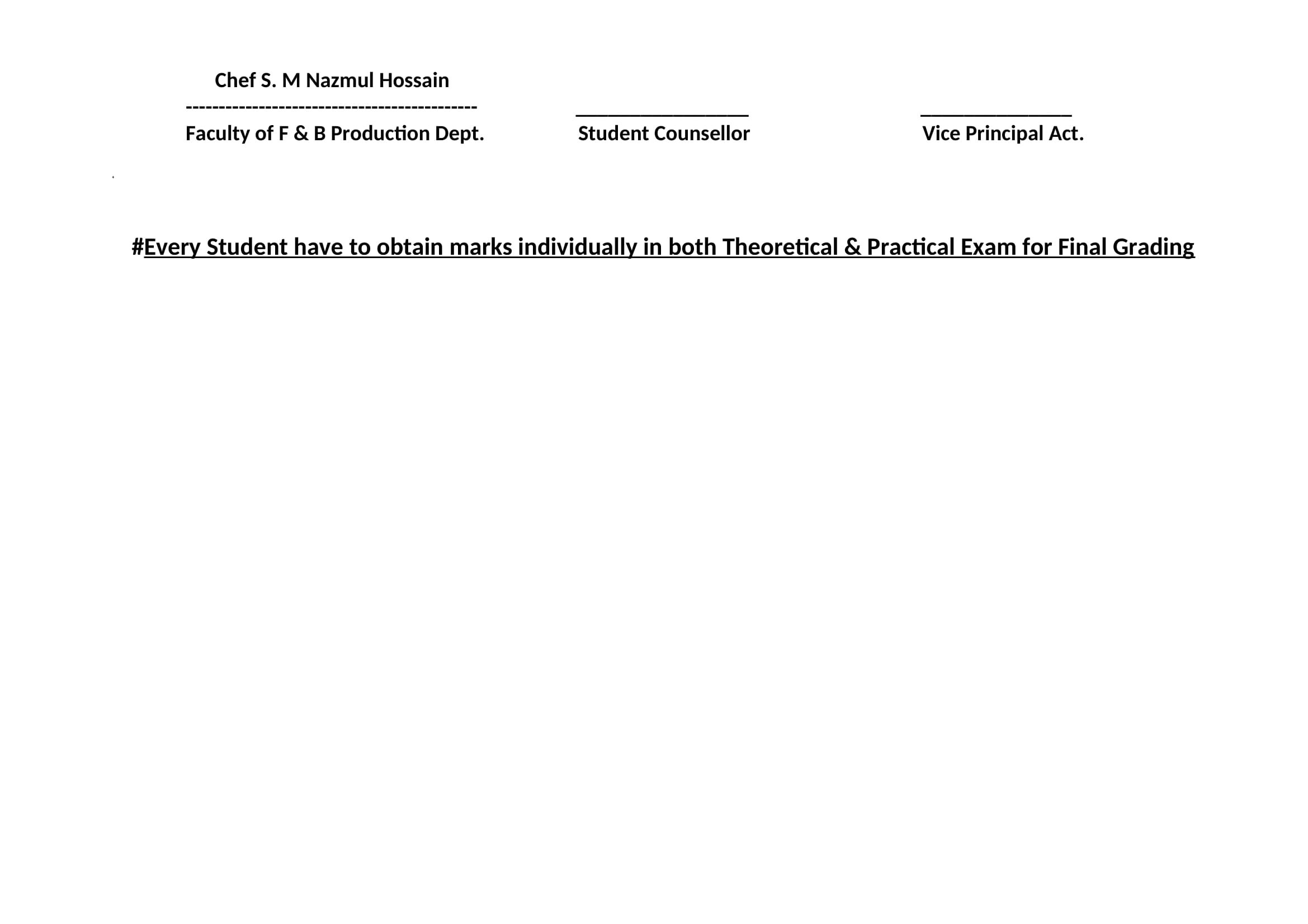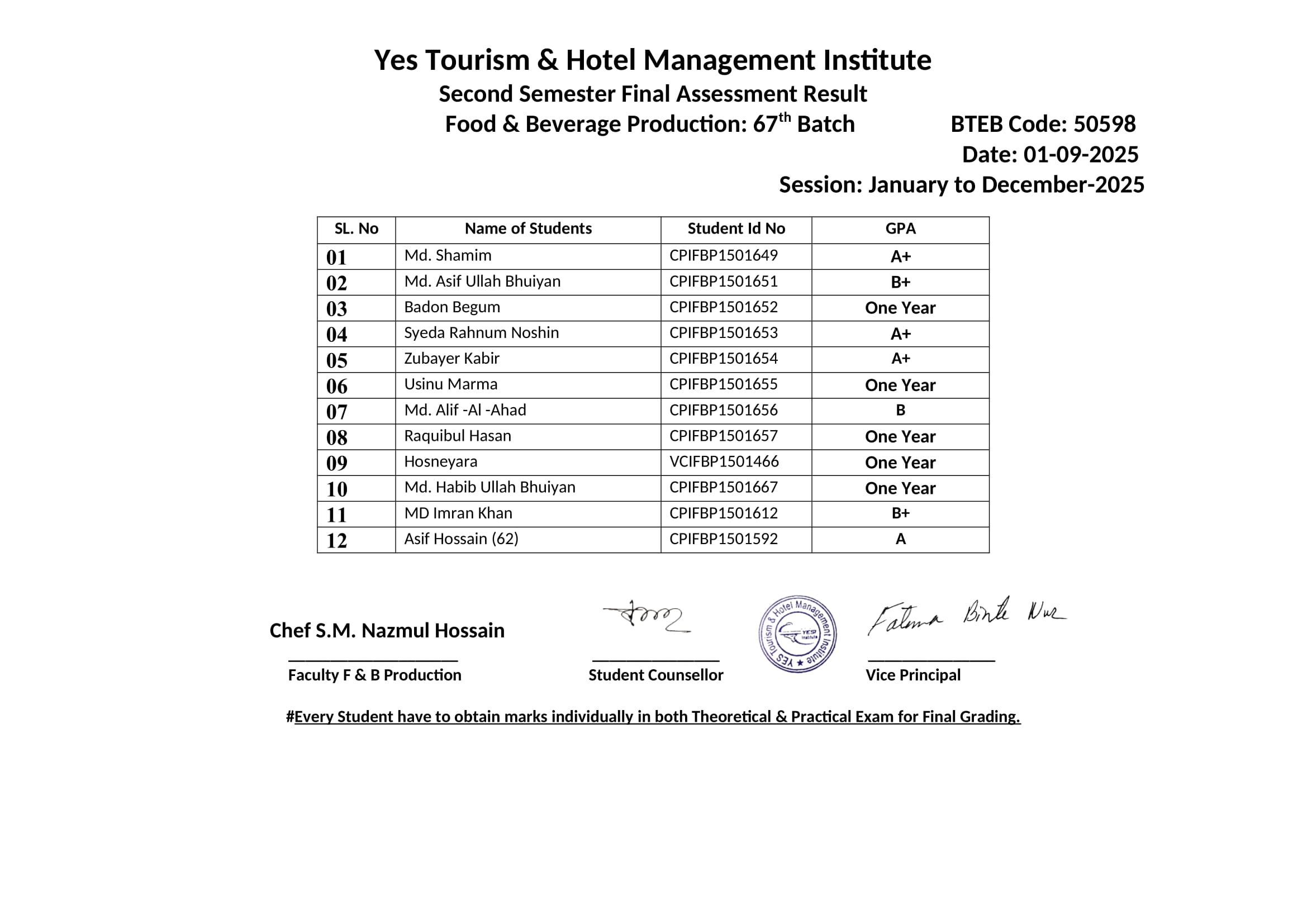 F & B Production 67th Batch 2nd Semester Final Result