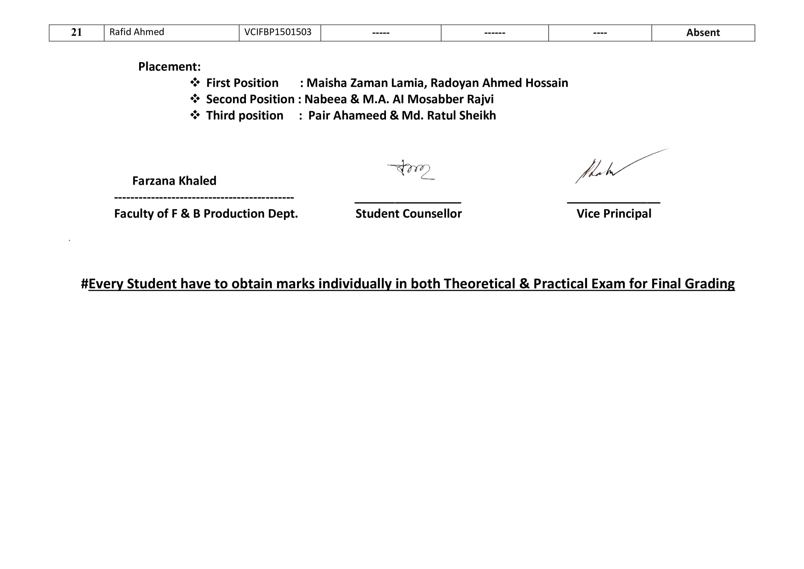 F & B Production 70th Batch 1st Semester Final Result