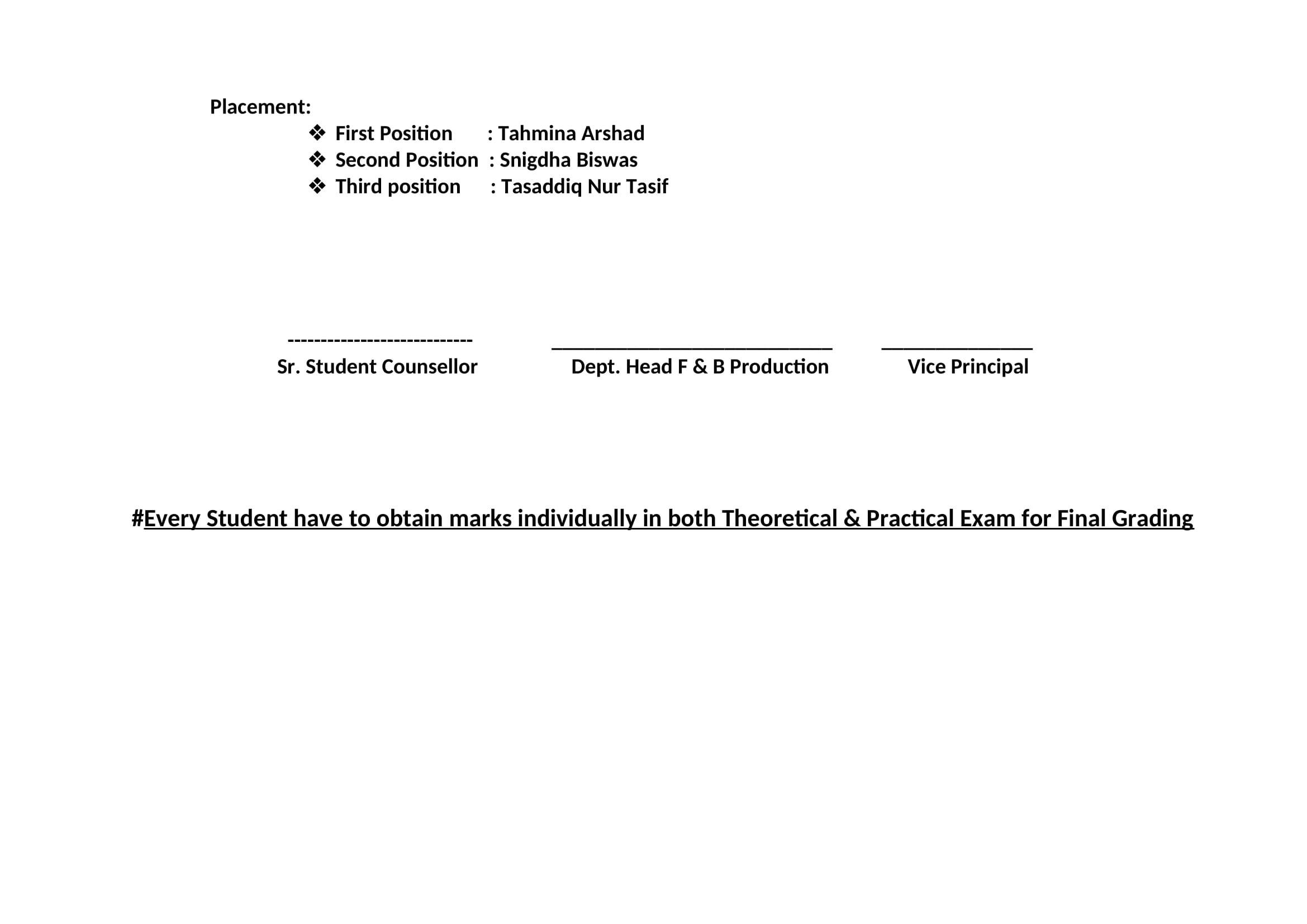 F & B Production 74th Batch 2nd Semester Final Result