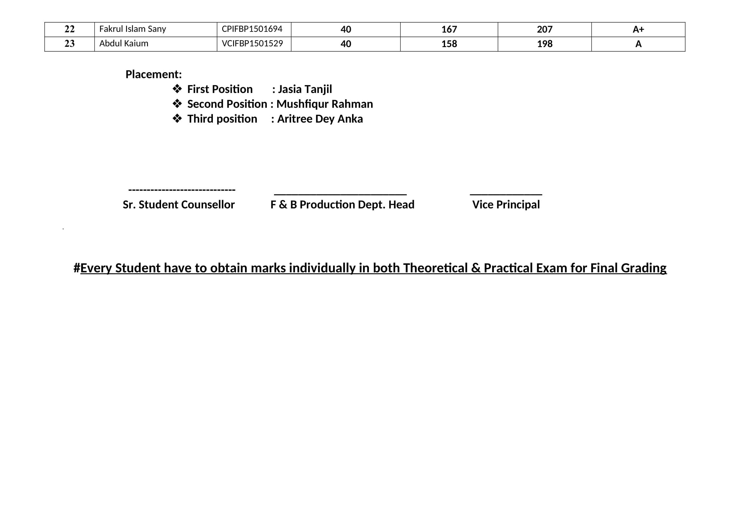 F & B Production 75th Batch 1st Semester Final Result